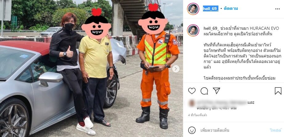 “ช่วงเช้าที่ผ่านมา HURACAN EVO ผมโดนเฉี่ยวท้าย ตูดเปิดโชว์อย่างที่เห็น ทันทีที่เกิดเหตุเฮียคู่กรณีเดินเข้ามาไหว้ขอโทษทันที พร้อมรับผิดทุกอย่าง ตัวผมก็ไม่ติดใจอะไรเป็นการส่วนตัว “รถเป็นแค่ของนอกกาย” และอุบัติเหตุก็เกิดขึ้นได้ตลอดเวลาอยู่แล้ว”